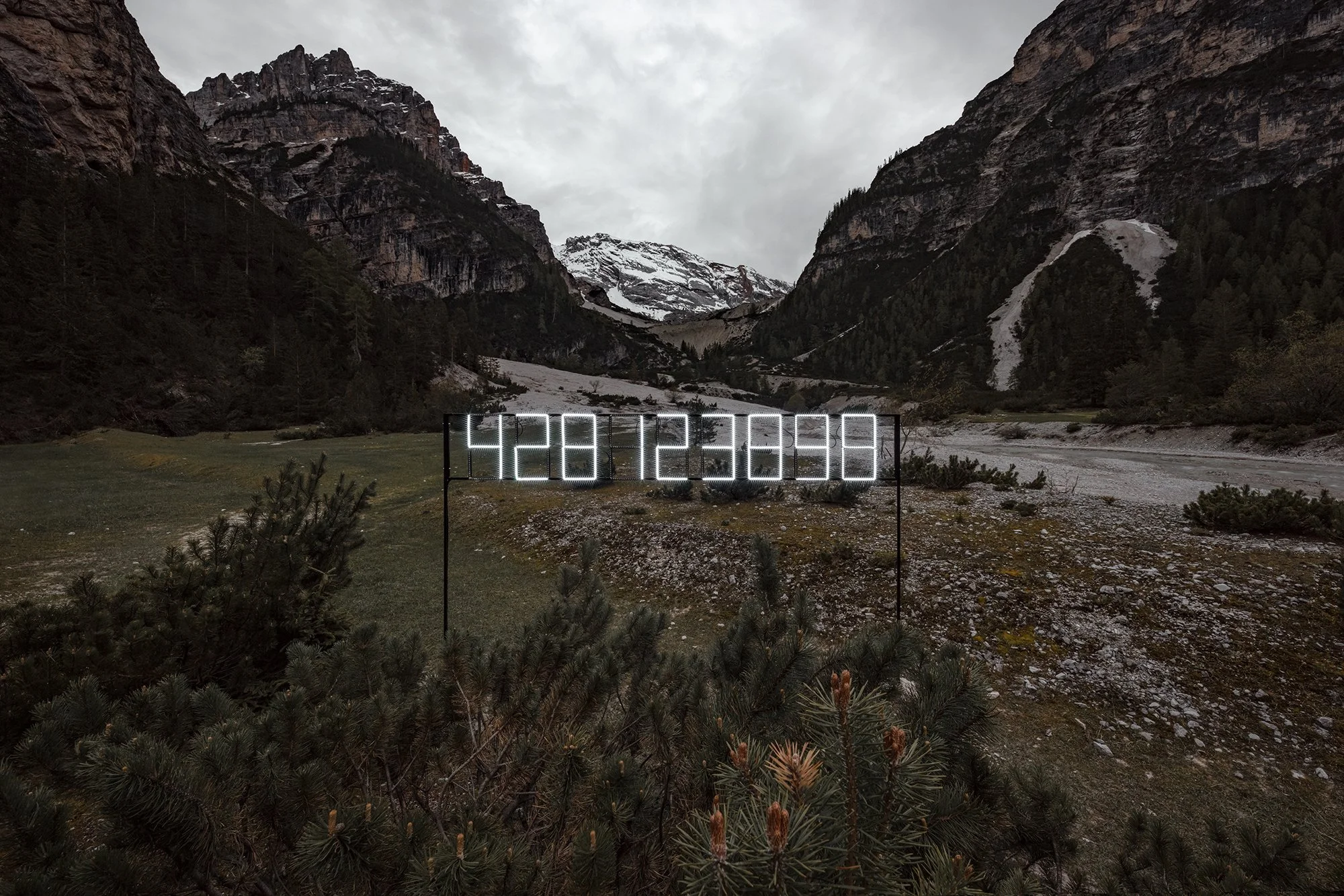 If we do not act now, it will be too late by 2035. Fragile is a synonym, it reminds us of our survival, of how we are all walking towards a date nobody can afford to be late. A large countdown will be activated on 4 June 2021 to remind us about the time left – counting down the seconds until 1 January 2035. That is when, according to recent studies, humanity will not be able to turn back unless it has implemented a radical energetic revolution in the context of its relationship with the planet. If we do not act now, we will not be able to limit the rise of temperatures to guarantee our survival, nor continue to supply energy to the entire world population. „2035“ is devised by the artistic duo VAZ and highlights the important role of everyone, a memorandum visible to visitors who happen upon it as they explore the mountains. Warning about this fragile situation is urgent, for it cannot be ignored.