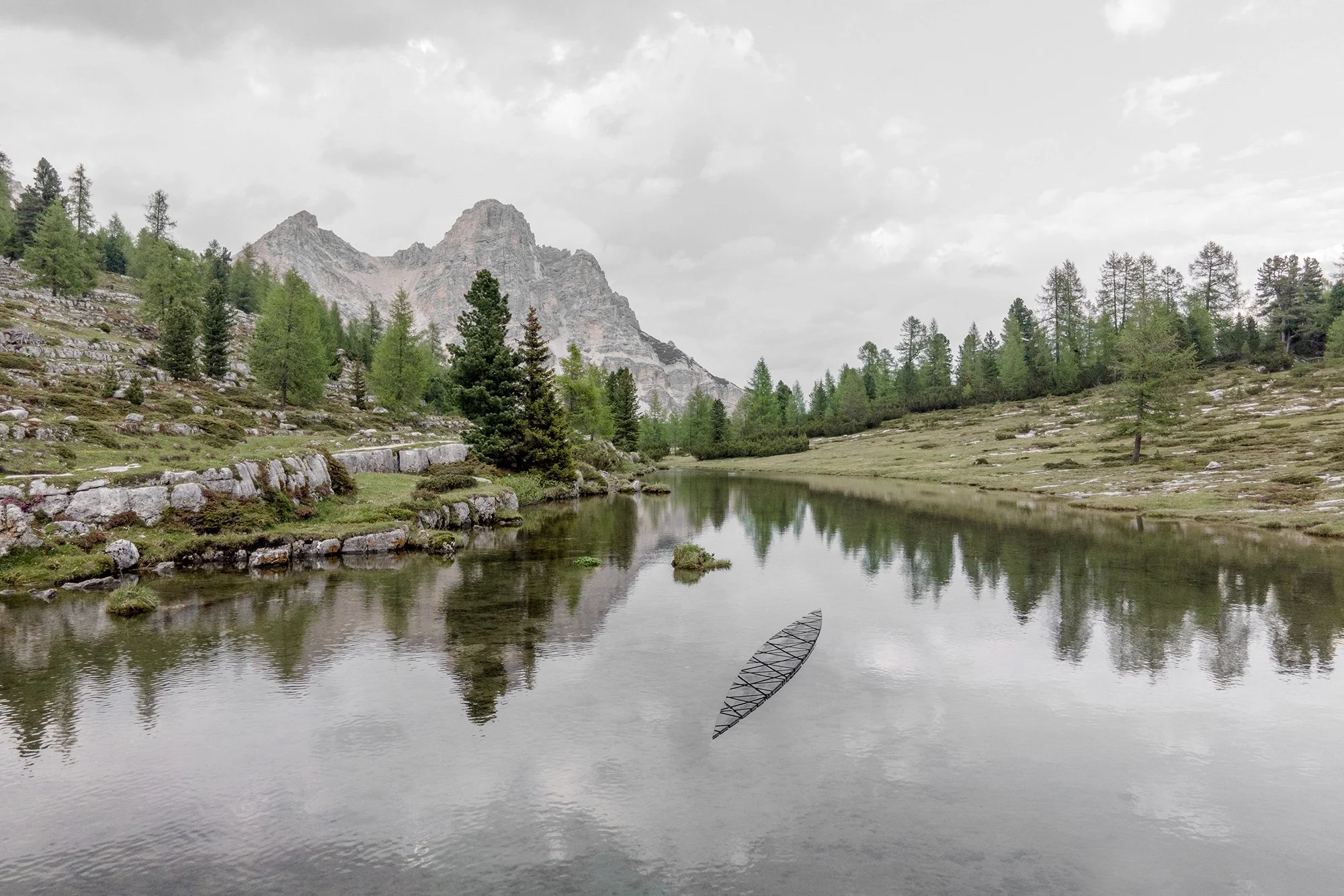 In Italian, the word “entanglement” can be translated as “bond” or “connection.” The artwork refers to the material and physical interconnections that exist between the farmer, the scythe blade, and the stone that sharpens it, or the digital connections that today’s technology user activates to get a response to their initial command. The reference to manual scything is made clear by the installation’s form, which is that of a whetstone: the tool used to sharpen a scythe and the symbol of this edition of the SMACH Biennale, dedicated to the relationship between humans and technology. Placed in the water, the black silhouette of “Entanglement” appears as a cut, a fissure—a disturbing element inserted into the idyllic scenery, reminding us how technological evolution has allowed humanity to dominate the animal, plant, and mineral kingdoms.
