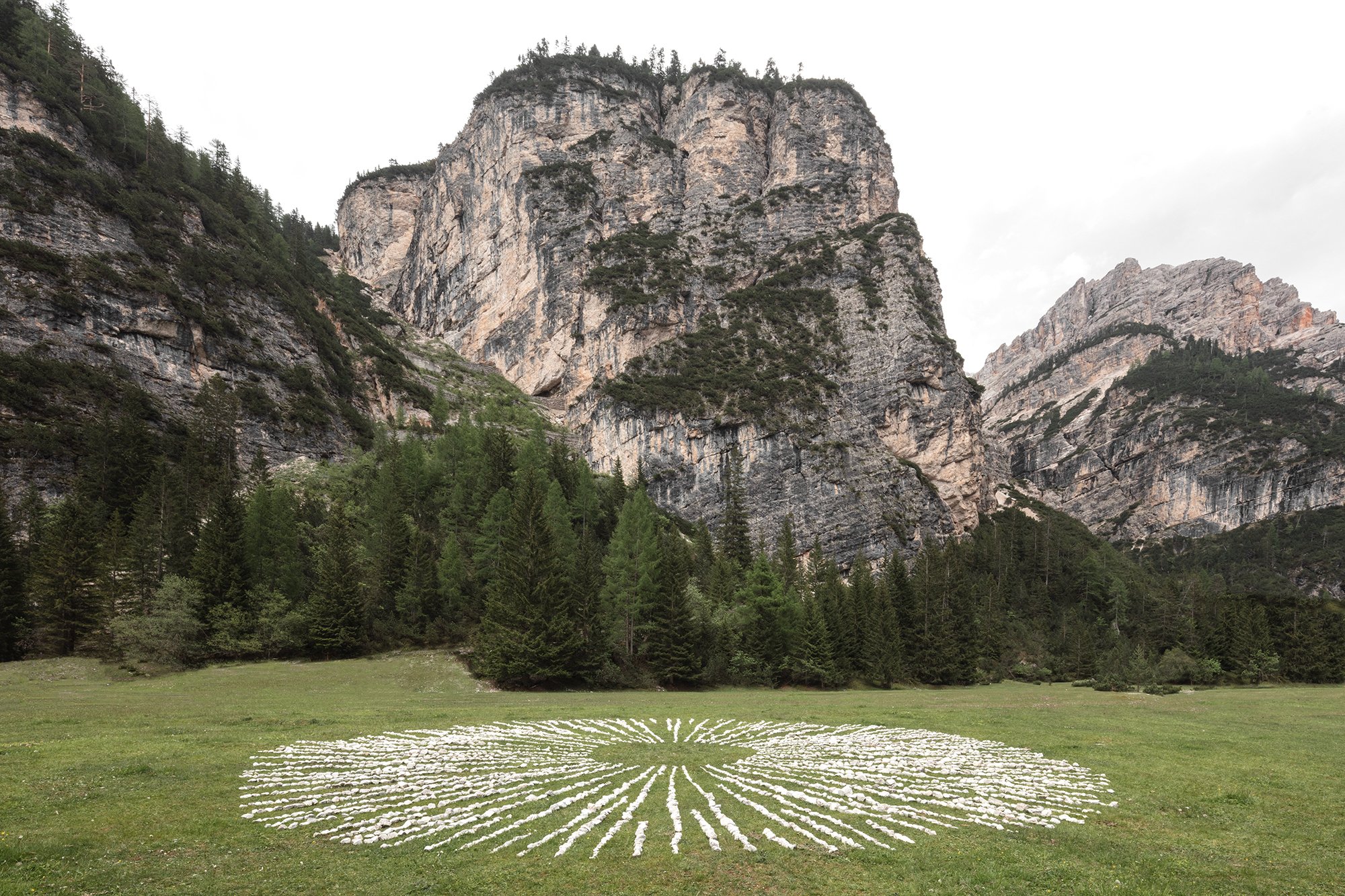 Egeon’s work, like most land art, uses only material found on site. The installation merges with the landscape and also refers to its war-torn past. This was the location of the Austro-Hungarian army infantry’s military barracks during World War I. This circle of rocks resembles a dolomite mandala or the ruins of an ancient building when seen up close; however, when observing it from above, it truly does resemble an Explosion. Not one caused by violence, rather the outline is traced by the fly agaric’s spores, one of the most iconic mushrooms. Explosion is an homage to the past, a symbol of caution for the present, and a celebration of this complex network – mushrooms’ hypha – which connects many natural living beings.