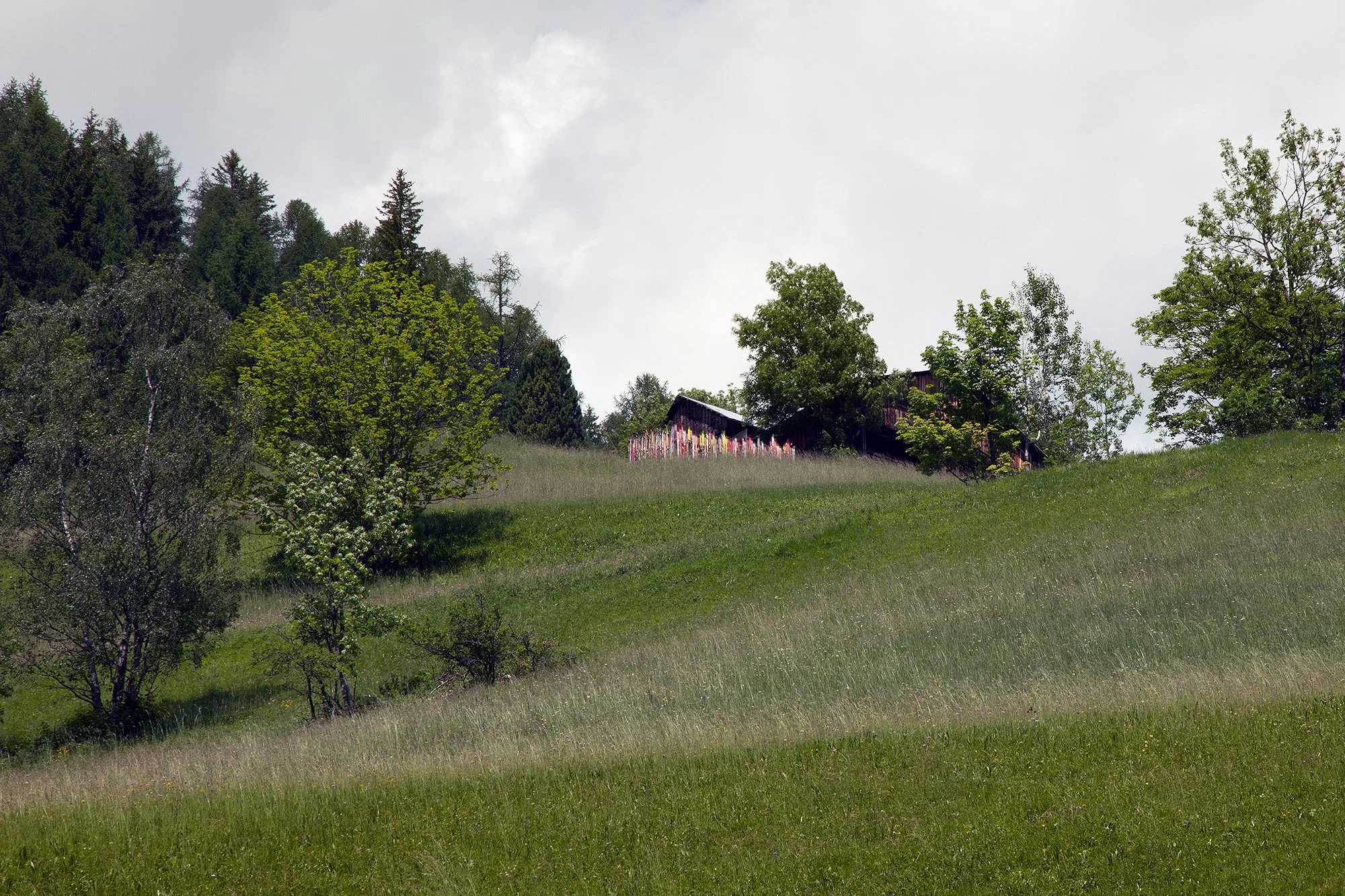 Alois Steger has built a square garden, delimited by an unusual fence, made of skis, and has filled it with rackets. The geometry of the garden refers to the supposed origin of the name Gadera (which names, in German, not only the river of the Val Badia, but the valley itself). The word is derived from the Latin quadra, which was a unit for measuring and allocating the areas that were occupied by Roman colonization. Ironic and critical interpretations go along with the historic location reference. The garden is made inaccessible by the alienated objects - a reference to the abundance of ski lifts and slopes in the valley area is not too far-fetched.