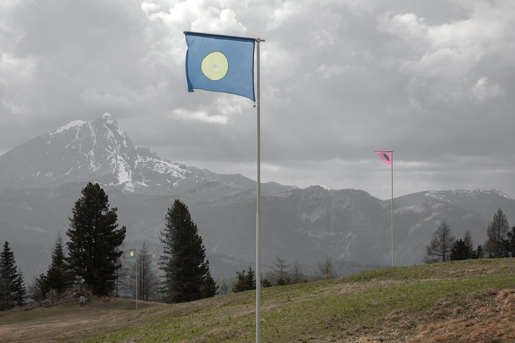 Flags are hoisted on the meadows, in evident contrast with their surroundings. These are fragile objects designed to vanish as time passes: the cotton fibres will be plucked up by the wind and, being totally biodegradable, they will weave back into the pattern of nature they are currently superior to. Or so it seems. “Nation State or State of a Nation” is a pun on the contemporary notion of state and nation: what is the “state” of nations today? The common narrative description belonging to a nation, the identity of a nation, the claim of a land – all these do not always reflect reality. Concepts which represent powerhouses but are, in reality, fragile because defined by people. What if the world knew no bounds? Especially in times like these, we have come to realise the arbitrariness of borders and, despite everything, how important collective organisation is. The flags are the emblems of these “superstructures” and artist Notta Caflisch questions their existence in today’s day and age.