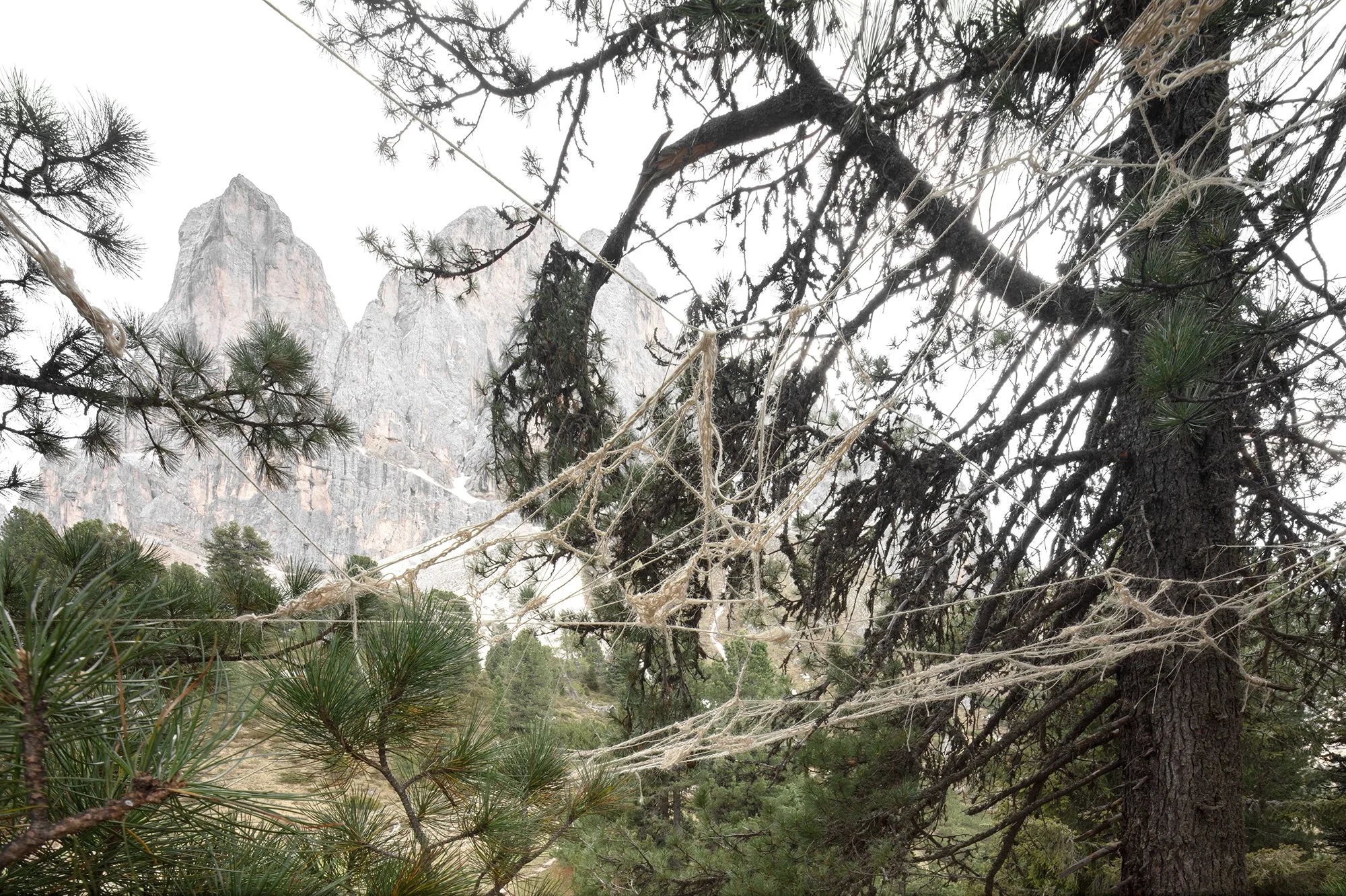 The work centres around the underground links between plants, mushrooms, bacteria, insects as well as the relationship between humanity and nature and synapses. A nexus. The artist knotted and crocheted, a widespread technique in Badia, over three kilometres of sisal thread, a natural fibre. This tangle of threads and knots wrap around the tree trunks, connecting them in a spider’s web, possibly a depiction of what Suzanne Simard dubbed Wood Wide Web in her 1989 [BTB1] research. The work and nature enter a dialogue straddling the border between natural and artificial, striking a sensible and sustainable balance. Nexus is also reminiscent of the human brain, whose dendrites and synapse create an infinite network of possible pathways.