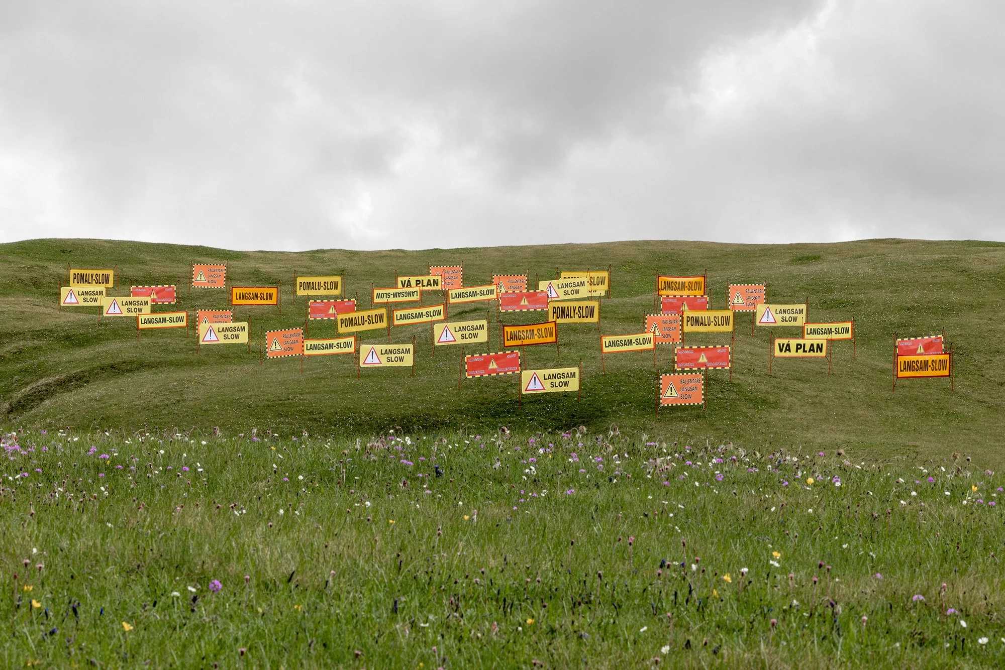 The windbreak fabric panels you see here are the same ones skiers encounter on the slopes before difficult sections, dangerous intersections, or obstacles in winter. Decontextualized, both by season and location, their message changes purpose and becomes a suggestion to slow down, not for immediate physical safety reasons, but for existential and ecological ones in the medium to long term. The grassy slope hosting the artwork becomes a space for reflection on themes and phenomena such as, on one hand, hyper-capitalist consumerism and rampant progress, and on the other, downshifting, cutting greenhouse gas emissions, and rethinking the human-nature relationship. The materials composing the installation were loaned by local ski resorts and an Austrian technical sponsor. In winter, they will return to their function as warnings on the ski slopes.