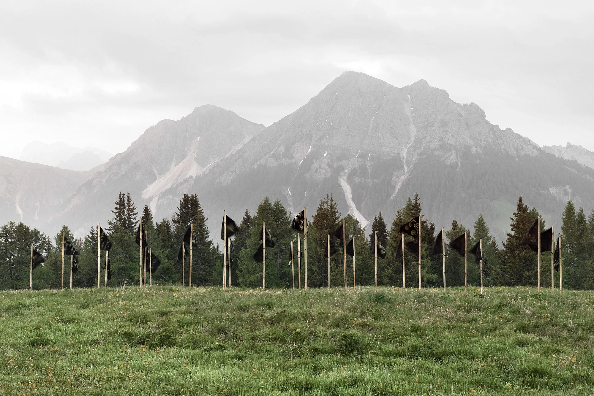 Over 40 years of research, Ulisse Aldrovandi (1522-1605) commissioned more than 8,000 reproductions of plants, flowers, fruits, and animals. These illustrations are collected in 18 volumes—whose title gives the installation its name—now preserved at the University Library of Bologna. The 33 flags you see here were illustrated by Buonafede, based on the originals by the Bolognese naturalist, and feature species of flora and fauna from Val Badia: arnica, orchids, bellflowers, snowdrops, carnations, mountain geraniums, globe flowers, anemones, gentians, pasque flowers, but also mushrooms, mosses, spiders, birds, butterflies, and ants. For Aldrovandi, the goal was to classify and represent all natural things and to make visible what, at the time, could not be shown in real life. Today, in the age of the internet, climate change, and neo-nationalisms, reproducing these illustrations and installing them as flags pays homage not to nation-states, but to the great kingdom to which all of us belong: the natural world.